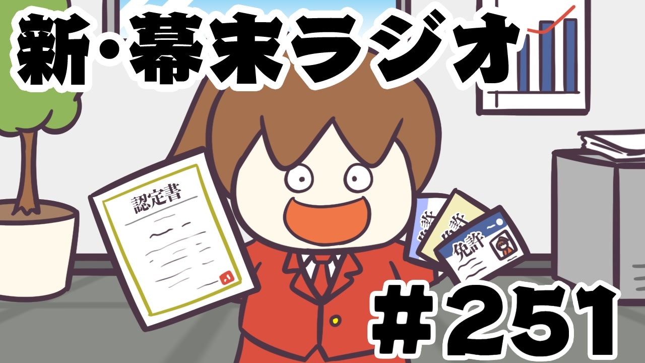 新・幕末ラジオ 2025年12月6日(土)放送分<br><br>1,坂本の家の物クイズ:<a href="#" class="seekTime" data-seekTime="0:01" onclick="seekNicoPlayer('#0:01'); return false;">#0:01</a><br>2,放送次第:<a href="#" class="seekTime" data-seekTime="27:09" onclick="seekNicoPlayer('#27:09'); return false;">#27:09</a><br>3,会員プレゼント:<a href="#" class="seekTime" data-seekTime="27:43" onclick="seekNicoPlayer('#27:43'); return false;">#27:43</a><br>4,ムギの健康診断:<a href="#" class="seekTime" data-seekTime="29:28" onclick="seekNicoPlayer('#29:28'); return false;">#29:28</a><br>5,幕末志士初の社員旅行へ:<a href="#" class="seekTime" data-seekTime="41:49" onclick="seekNicoPlayer('#41:49'); return false;">#41:49</a><br>6,中岡コーナー「資格ハンター坂本」:<a href="#" class="seekTime" data-seekTime="58:40" onclick="seekNicoPlayer('#58:40'); return false;">#58:40</a><br><br><a href="https://www.nicovideo.jp/watch/so45783431" class="watch">so45783431</a>←第250回 第252回→<br>(会員限定)新幕末ラジオマイリスト:<a href="https://www.nicovideo.jp/mylist/78814077" target="_blank" rel="noopener">mylist/78814077</a><br>(会員限定)旧幕末ラジオマイリスト:<a href="https://www.nicovideo.jp/mylist/55616469" target="_blank" rel="noopener">mylist/55616469</a><br><br>更新情報(Twitter) → <a href="https://twitter.com/kirizaki_ei" target="_blank" rel="noopener nofollow">https://twitter.com/kirizaki_ei</a><br>ゲーム実況まとめ : <a href="https://www.nicovideo.jp/mylist/8299531" target="_blank" rel="noopener">mylist/8299531</a><br>単発動画まとめ : <a href="https://www.nicovideo.jp/mylist/10539272" target="_blank" rel="noopener">mylist/10539272</a><br>生放送まとめ : <a href="https://www.nicovideo.jp/mylist/53482635" target="_blank" rel="noopener">mylist/53482635</a><br>幕末志士チャンネル : <a href="https://ch.nicovideo.jp/bakumatsu" target="_blank" rel="noopener">ch.nicovideo.jp/bakumatsu</a><br>